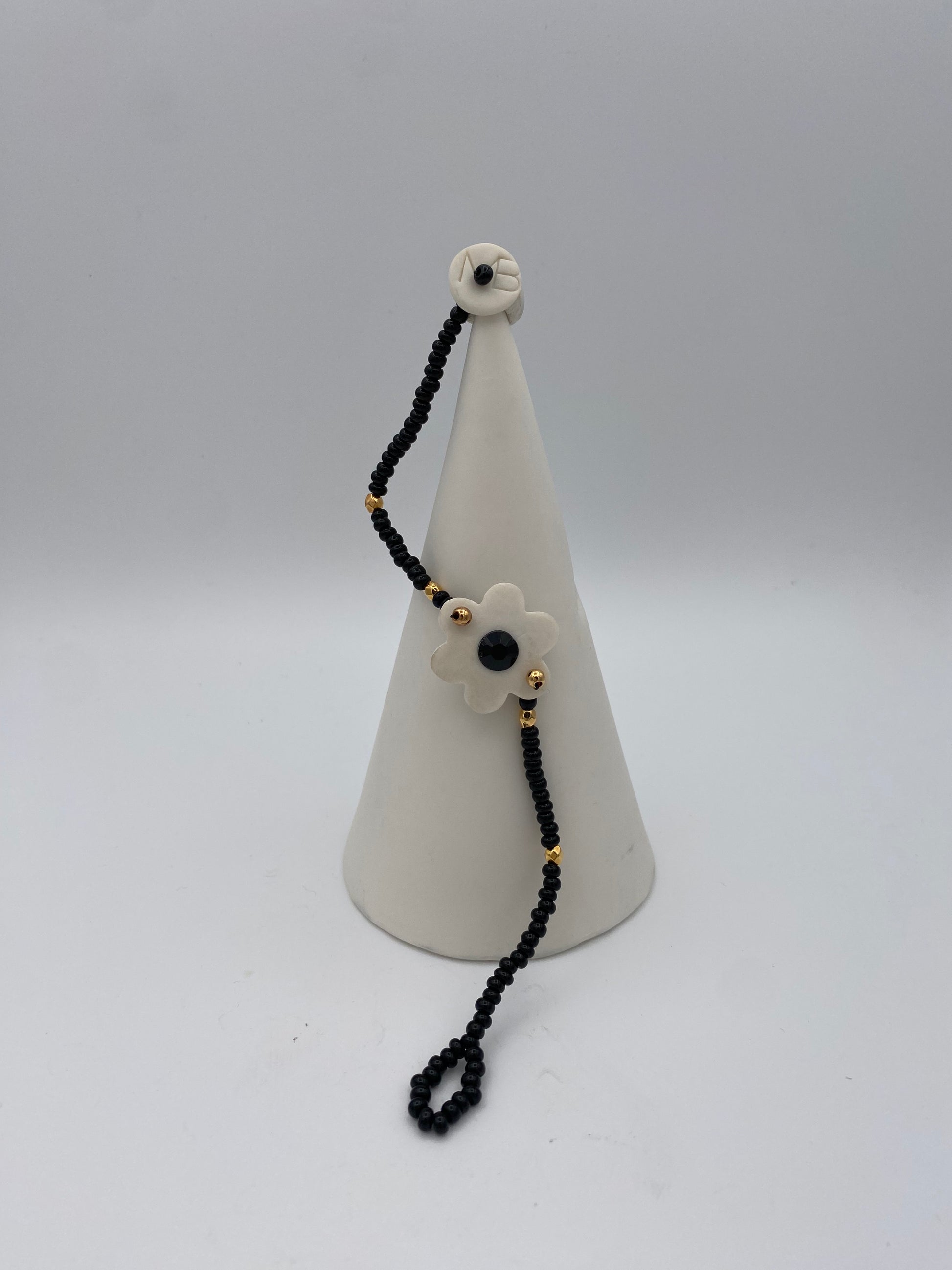 Armband zwarte kraaltjes, witte porseleinen bloem met zwarte decoratie, voor polsomtrek 17 tot 19 cm, totale lengte armband tot lus van slotje 17 cm
