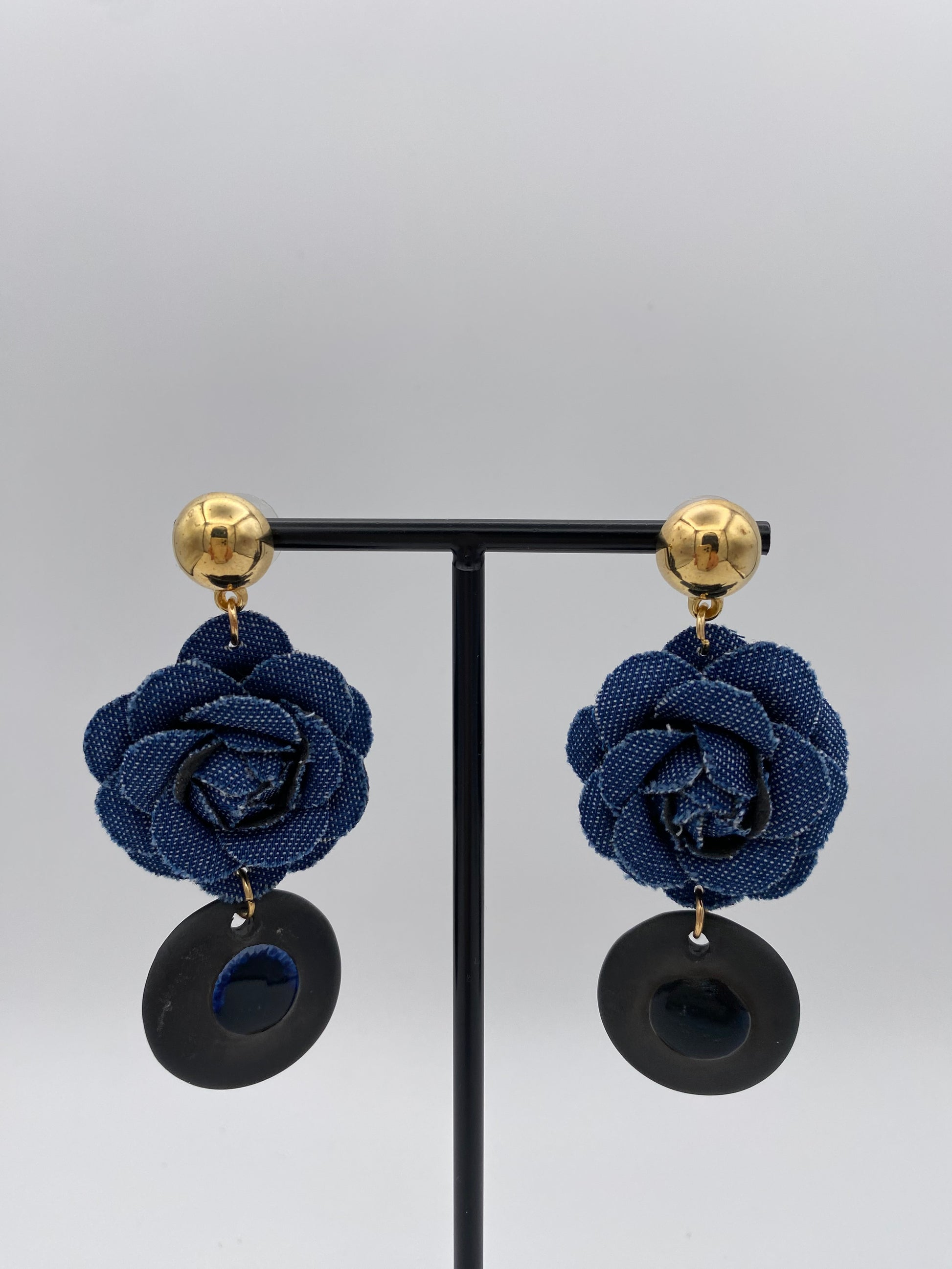 Oorringen goudkleurige stekertjes, jeansbloempje en zwarte porseleinen ronde, gedecoreerd met blauw glazuur, totale lengte 8 cm