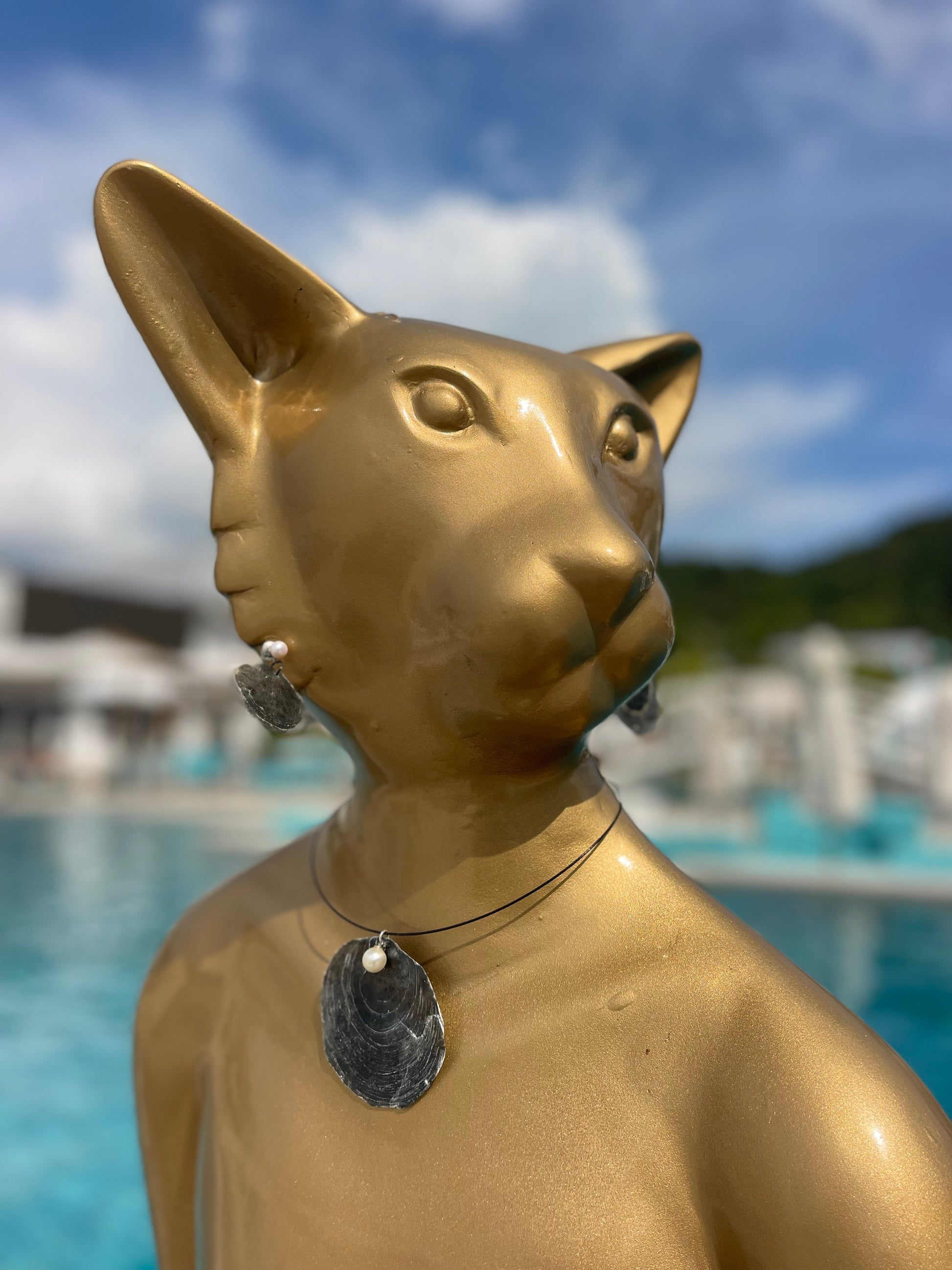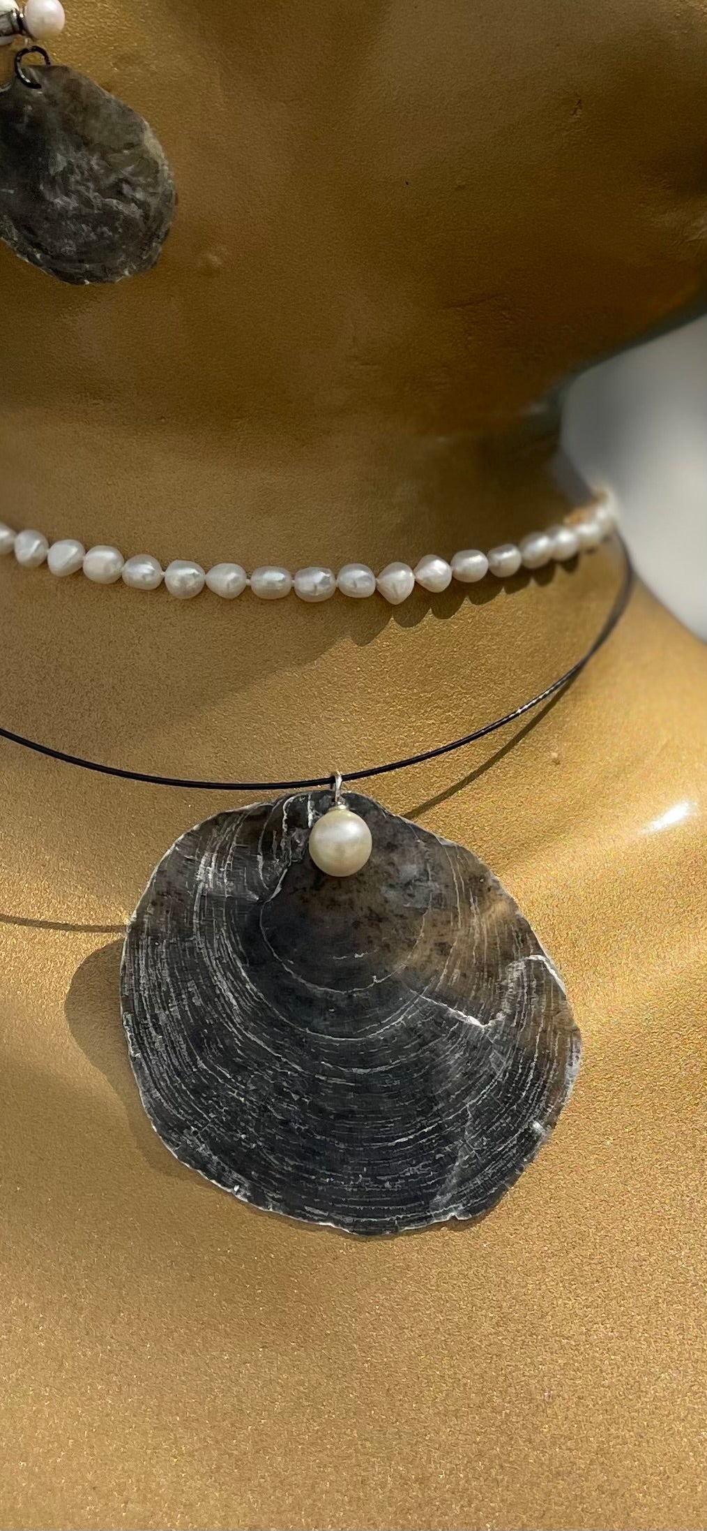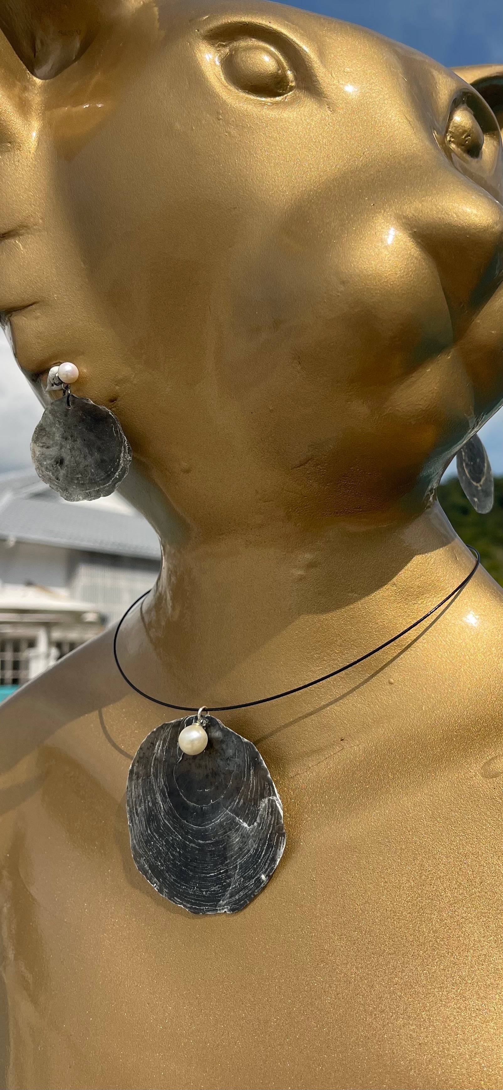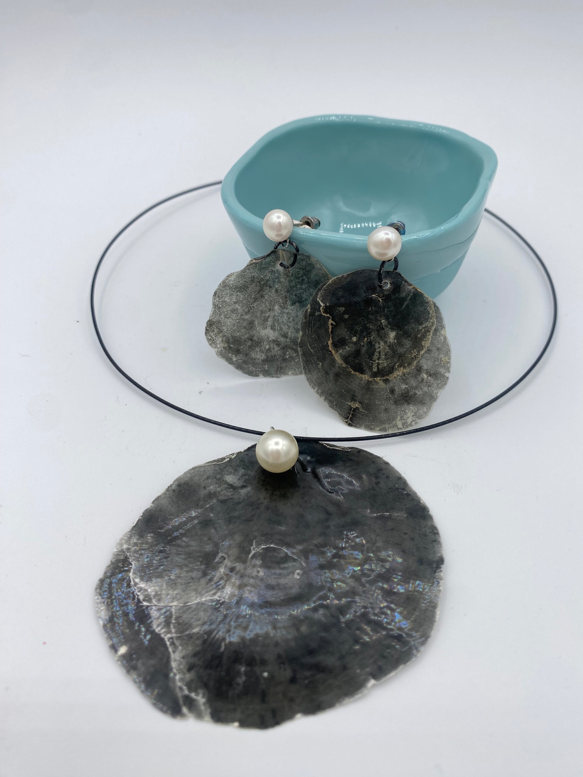 Zwarte parelmoeren schelpafdruk, aangespoeld op het strand in Cenang, Maleisië, verwerkt met een pareltje, aan een metalen omega koordje, hanger 8 cm en bijpassende oorbellen, metalen stekertjes, lengte totaal 5.5 cm, mooi om eventueel te combineren met een parelketting