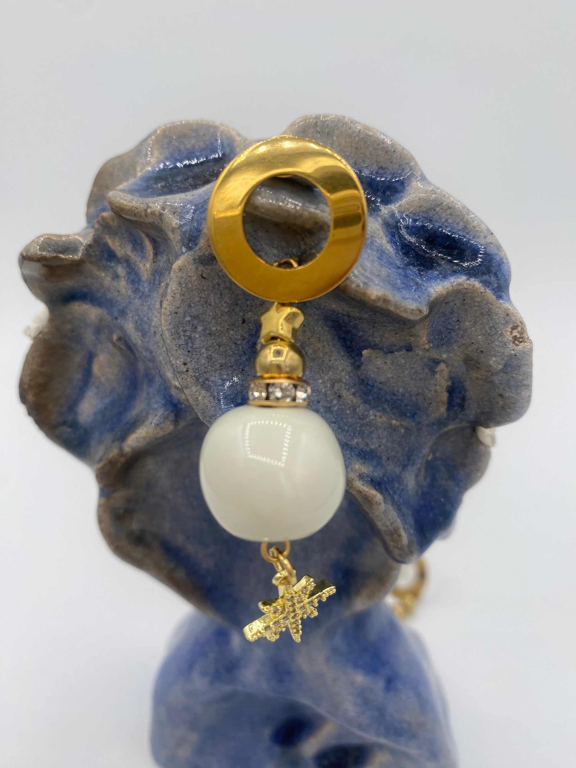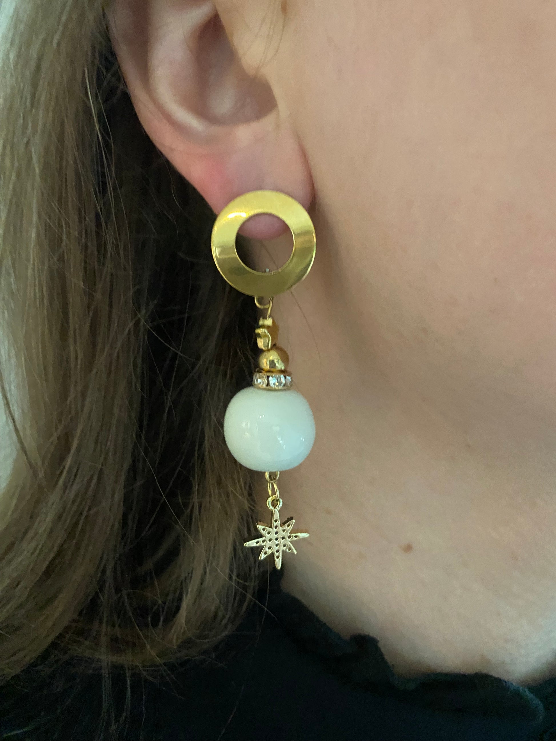 Oorhangers, stainless steel goudkleur, kraal in porselein en decoratief sterretje, totale lengte 6 cm