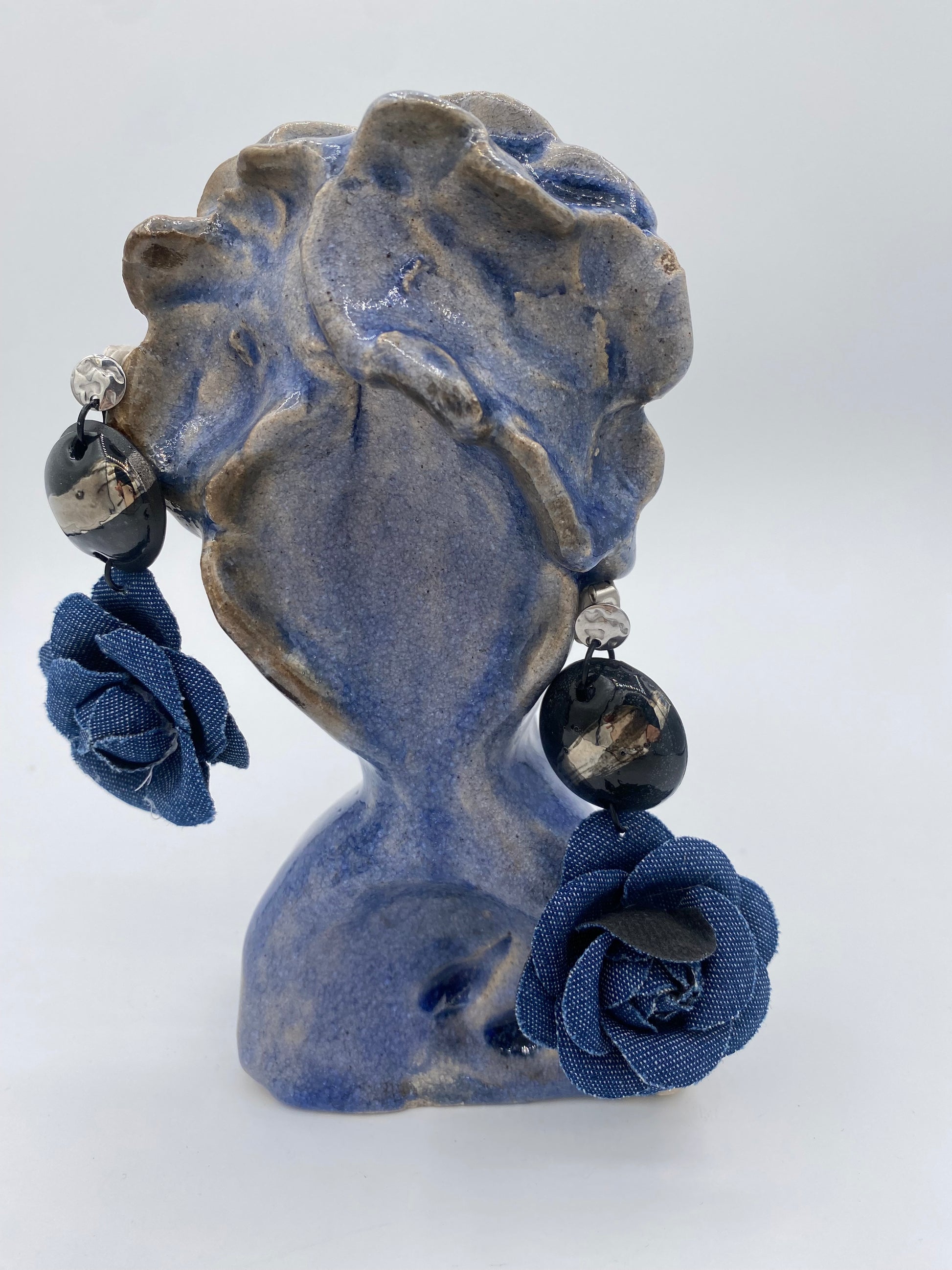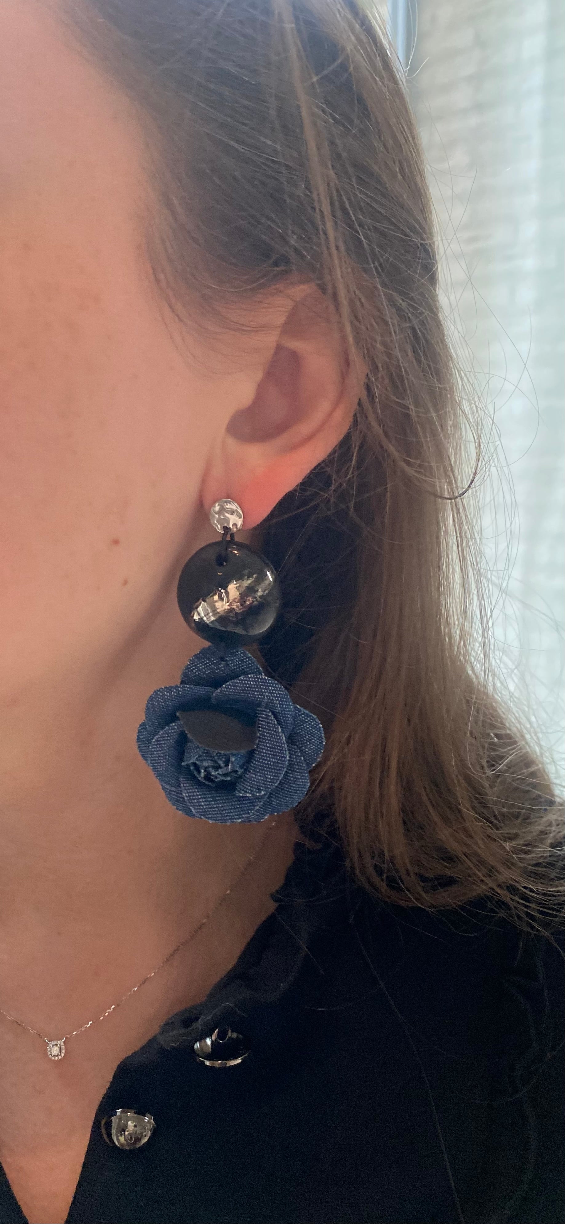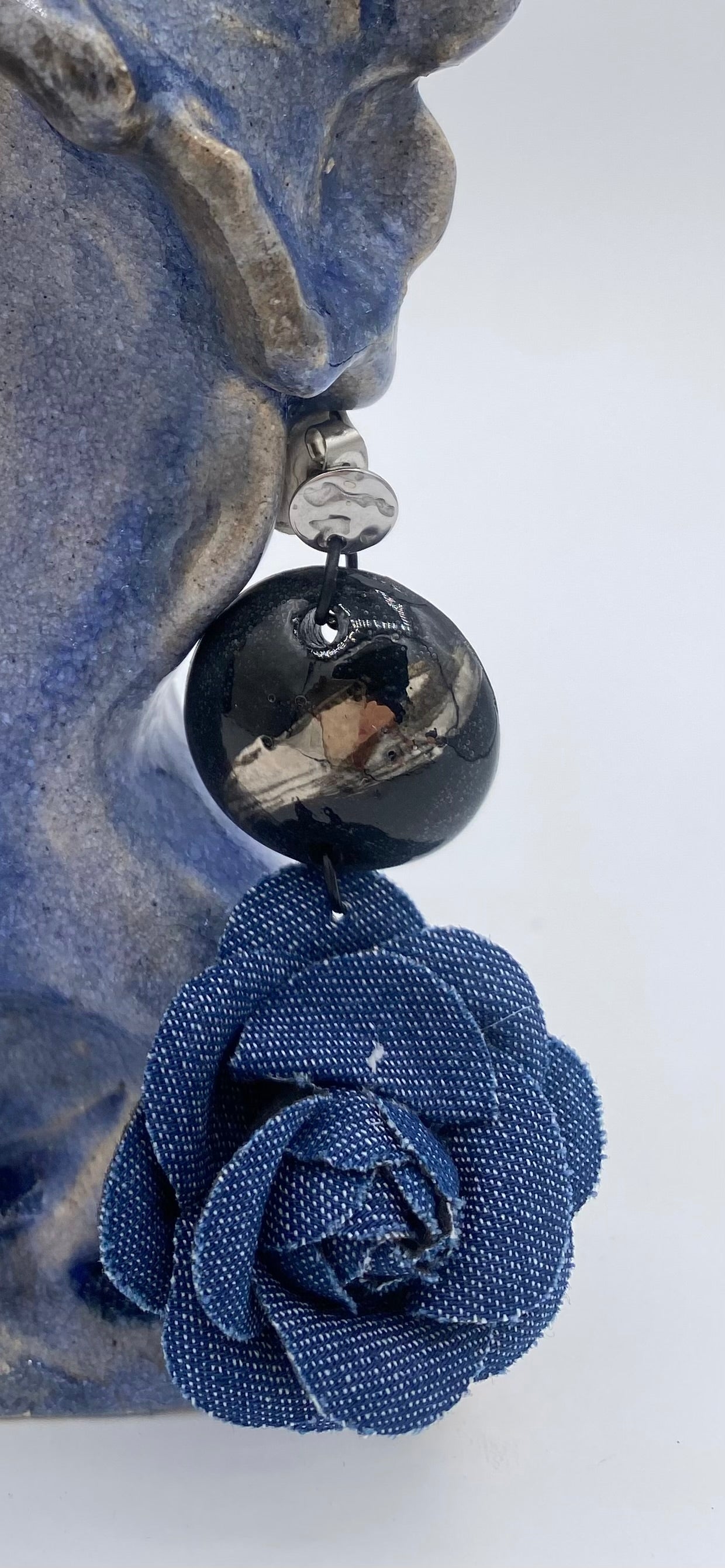 Oorstekers stainless steel, zwart porseleinen ronde met zilver luster gedecoreerd en jeansbloemetje