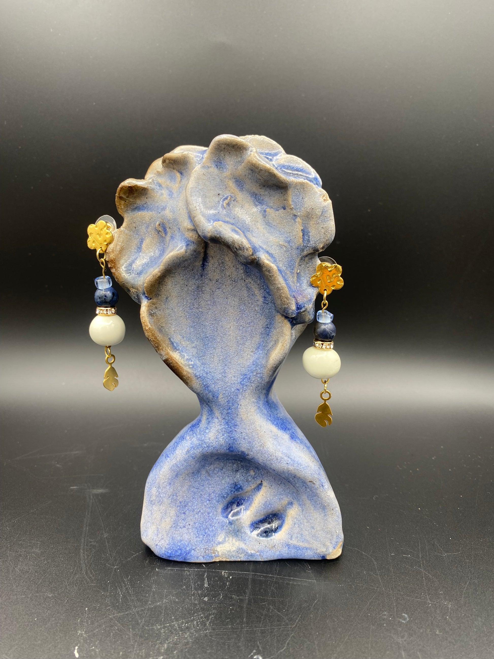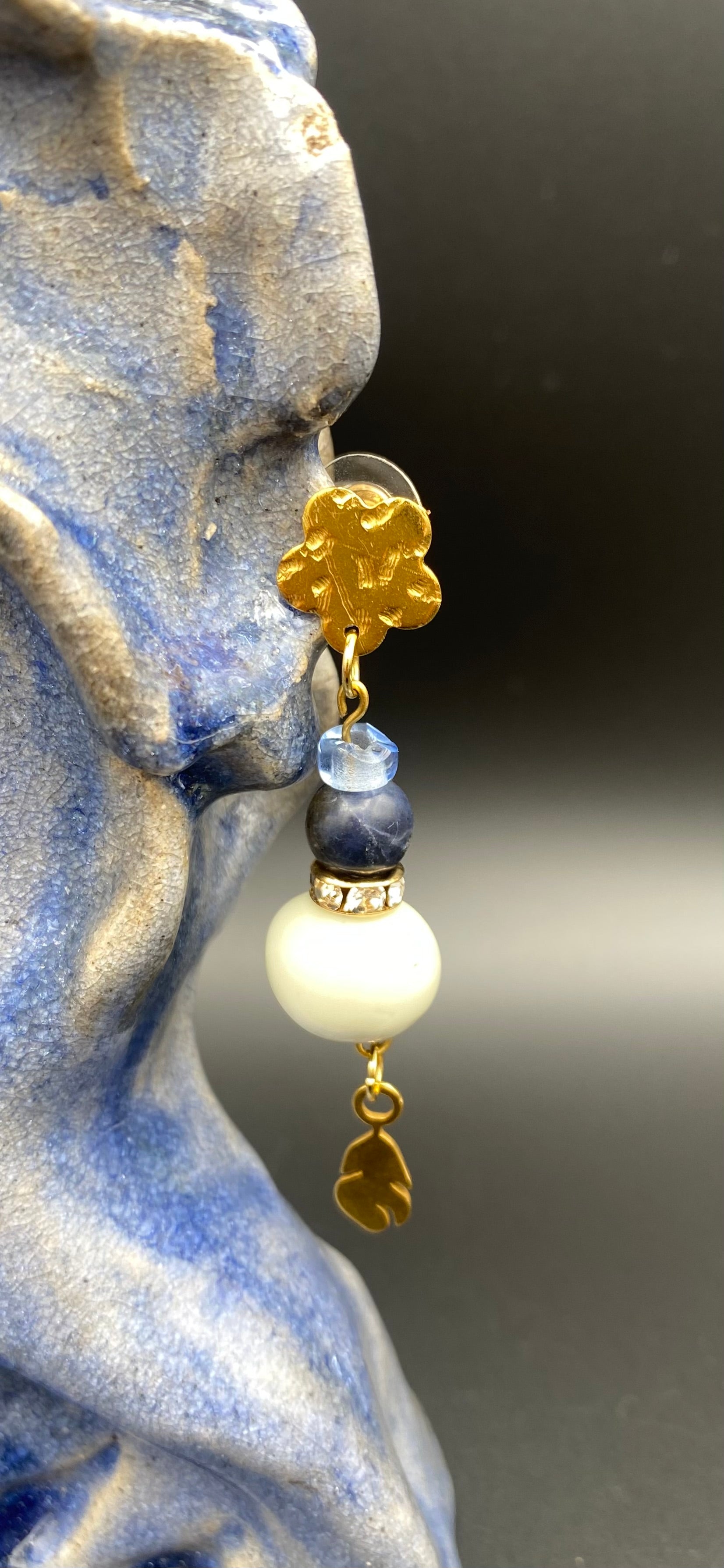 Oorhangers, goudkleurige stekertjes, wit porseleinen kraal, gouden blaadje, totale lengte 6,5 cm