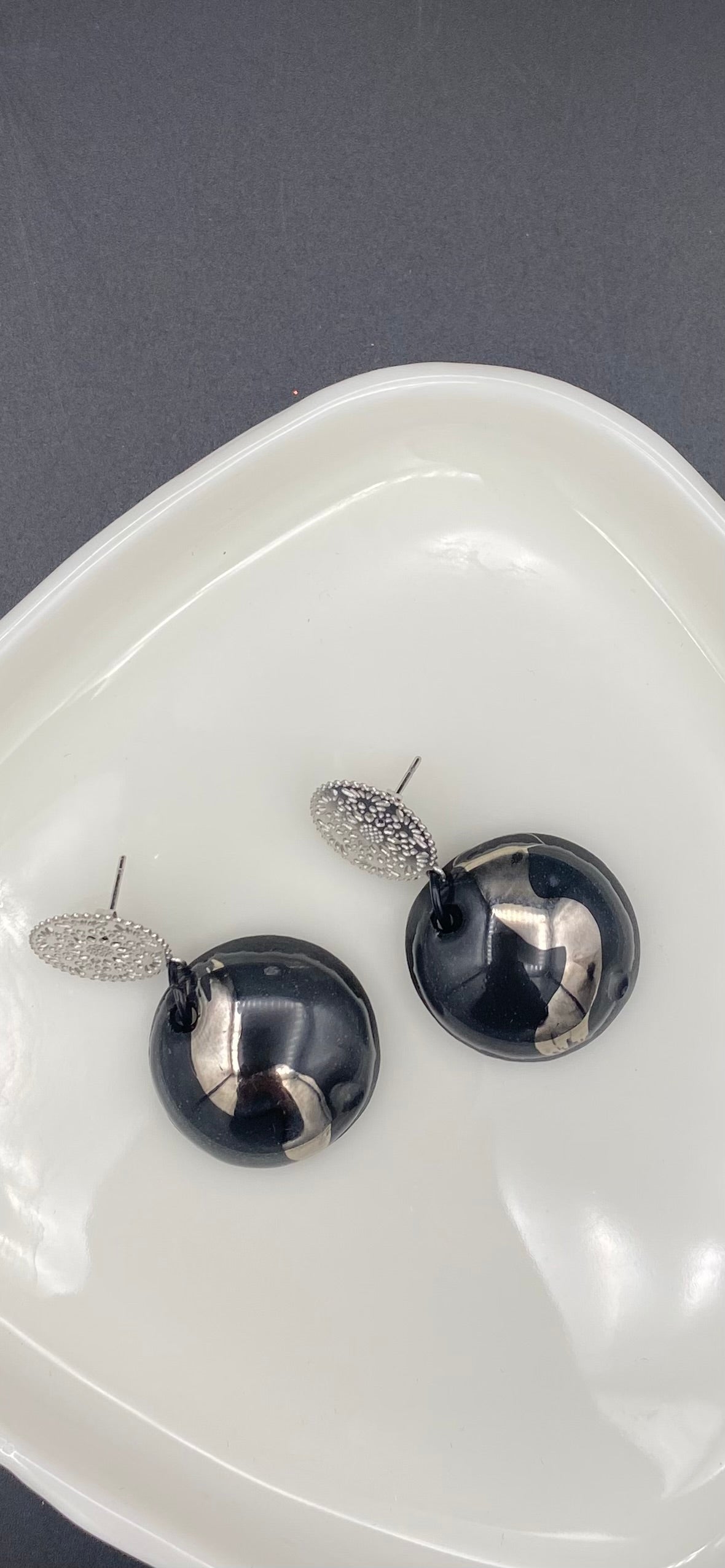 Oorringen zilverkleurige stekertjes met zwarte porseleinen hanger rond, totale lengte 4 cm
