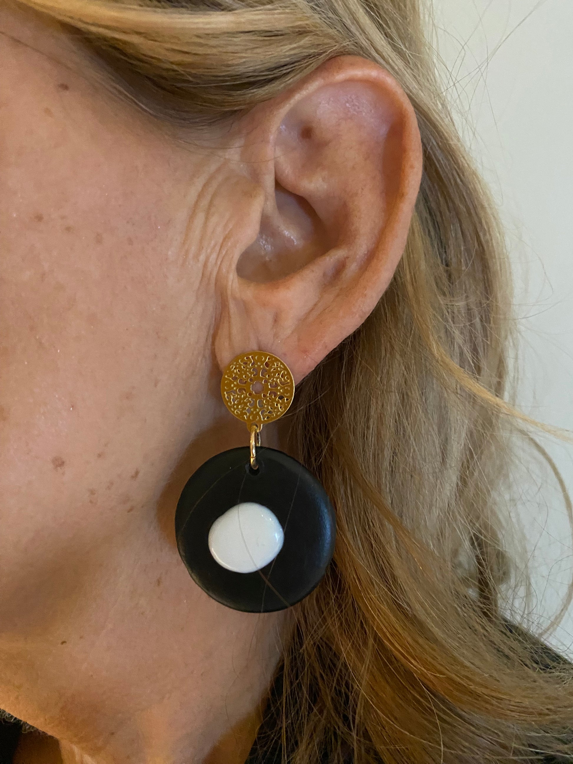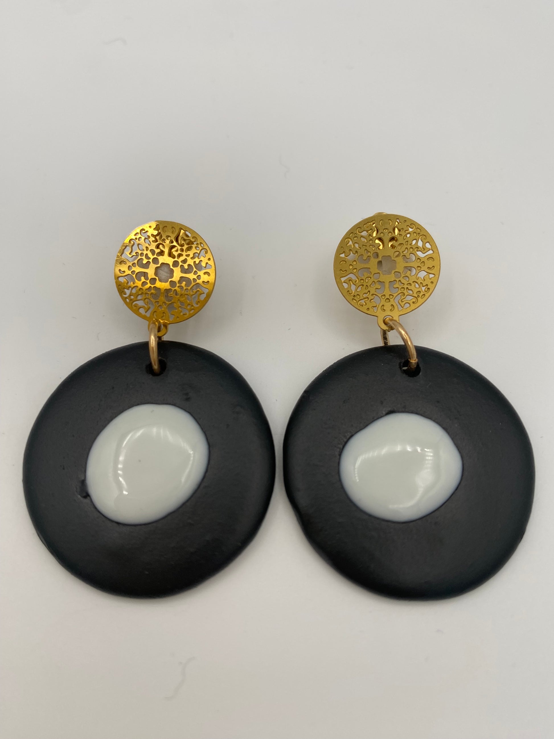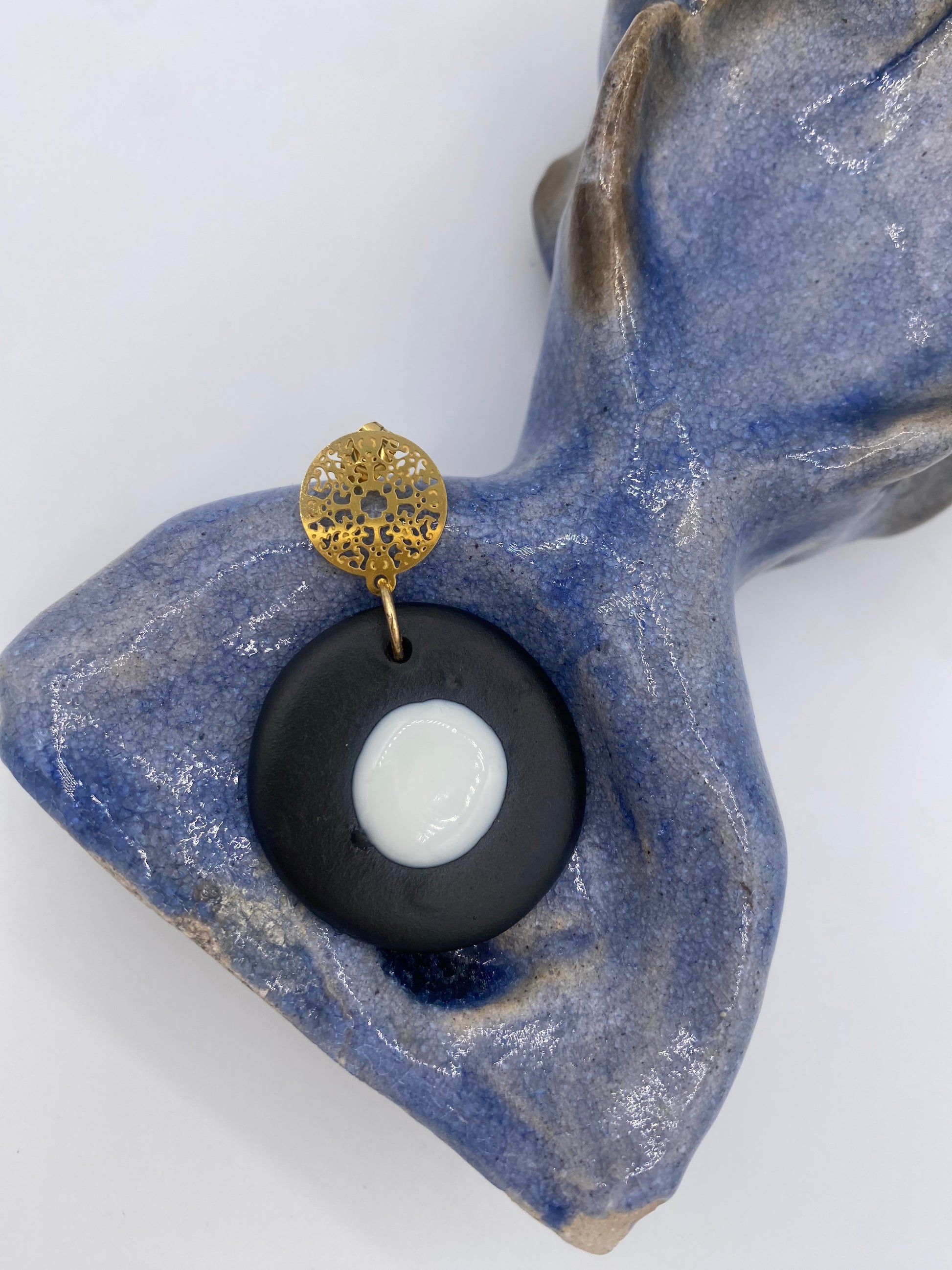 Ooringen zwart porselein, zeer dun, met witte porseleinen decoratie, goudlook stekertjes