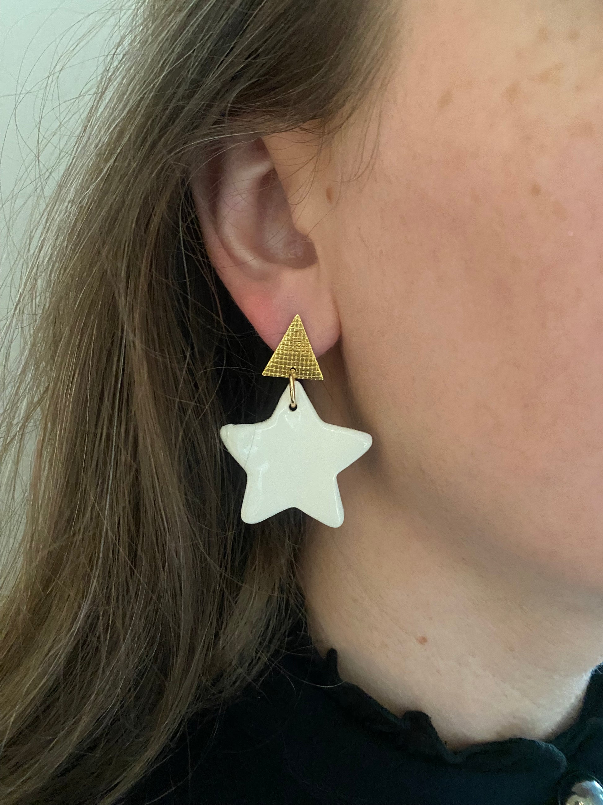 Oorbellen stekertjes stainless steel goudkleur, porseleinen sterretje, totale lengte 4.5 cm
