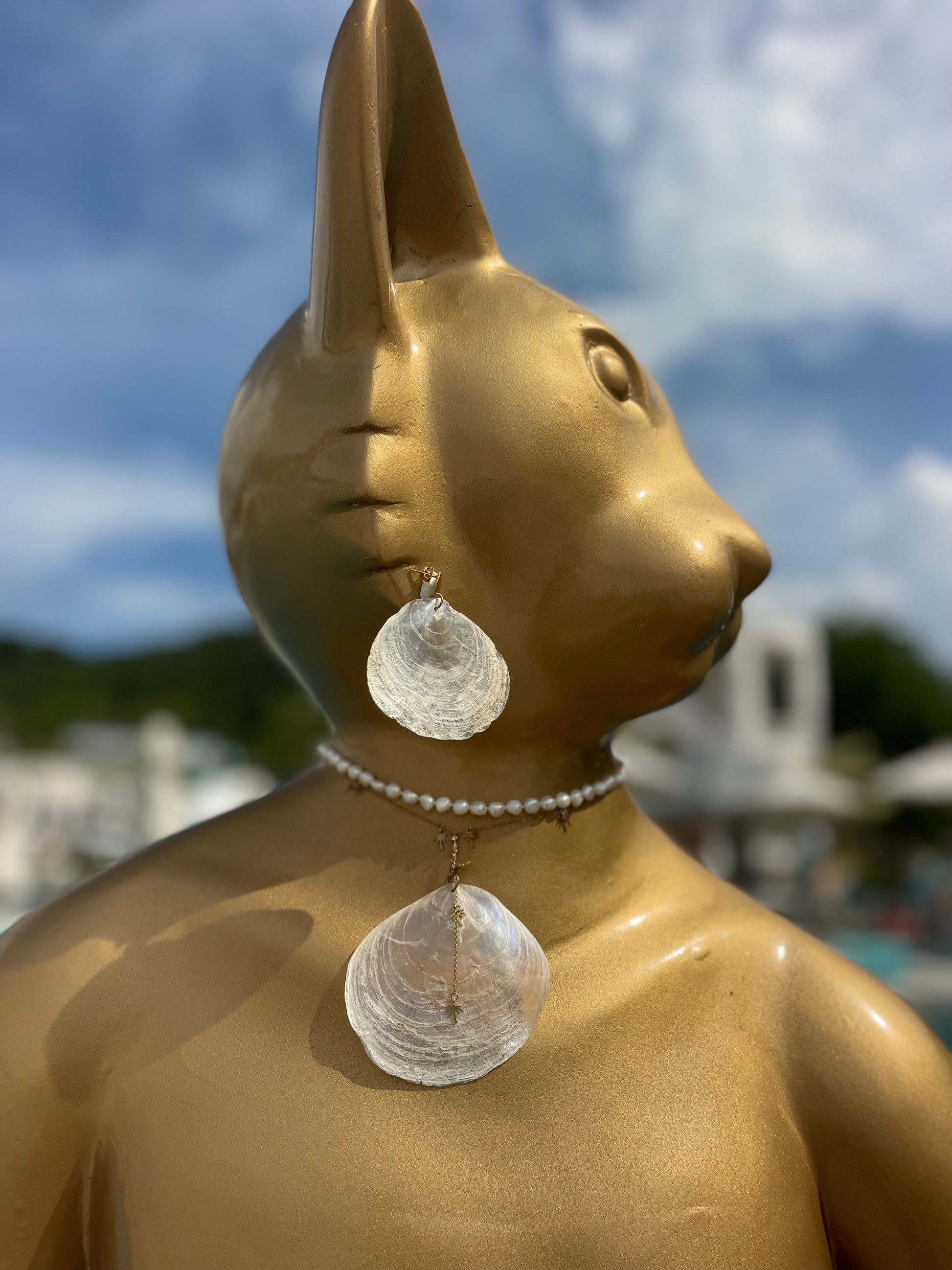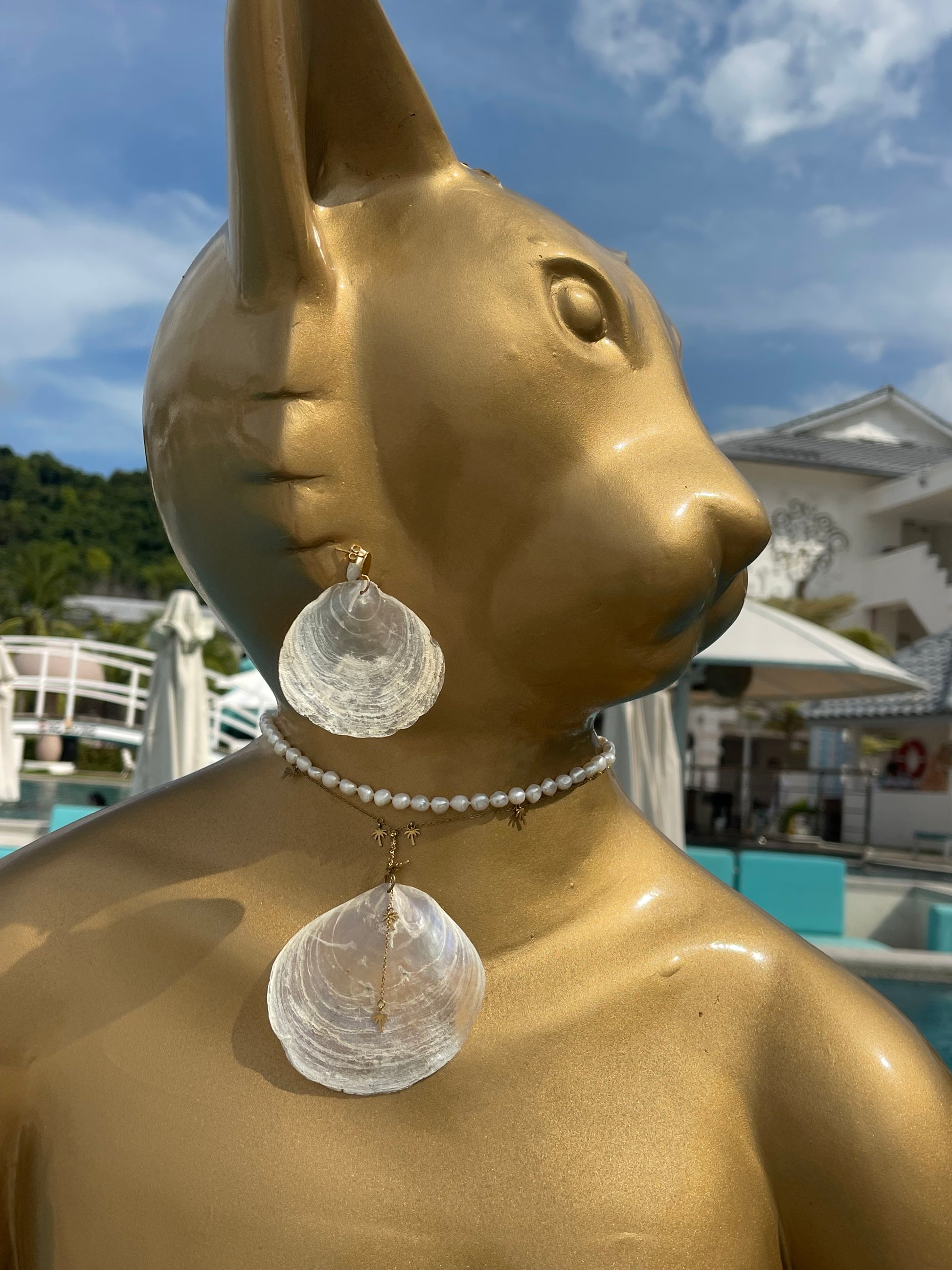 Ontdekt, ontworpen en gemaakt in Maleisië, hanger, witte parelmoerafdruk van schelp, gecombineerd met stainless steel goudkleurige ketting met palmboompjes, want palmbomen en schelpen gaat goed samen